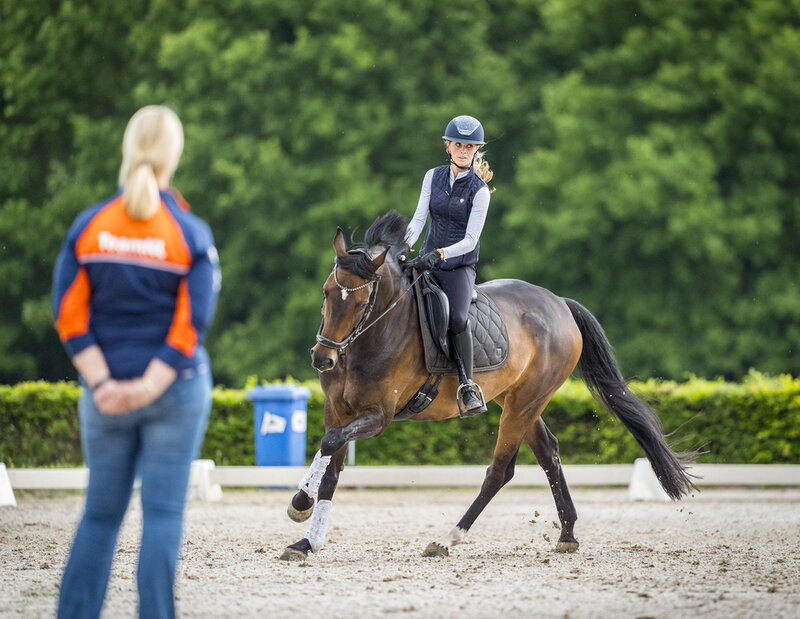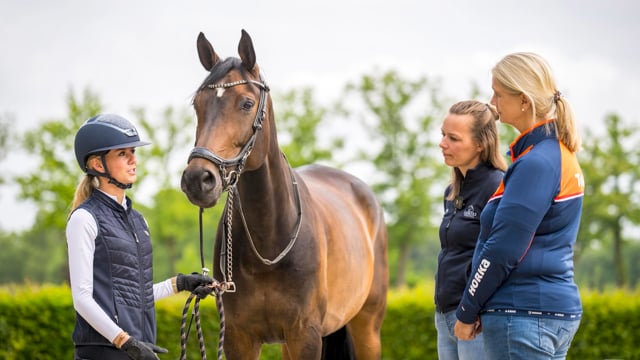 Dewi mag haar paard opzadelen en start met de warming-up. “Het losrijden is misschien wel het belangrijkste stuk van je training. Natuurlijk moet je paard warm worden en daar de tijd voor krijgen. Maar denk niet: ik ga een beetje ronddraven, rondgalopperen en dan begin ik in één keer met paardrijden”, zegt bondscoach Monique Peutz. “Tijdens het losstappen moet je al proberen om je paard in verbinding naar je hand te krijgen. Controleer of ze voor je been een beetje naar voren wil. Neemt ze je hand al een beetje mee? Is de stap actief? Kun je al een beetje links en rechts buigen?”