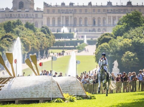 dinja van liere tijdens een olympische wedstrijd met hermès n.o.p. met het paleis van versailles op de achtergrond
